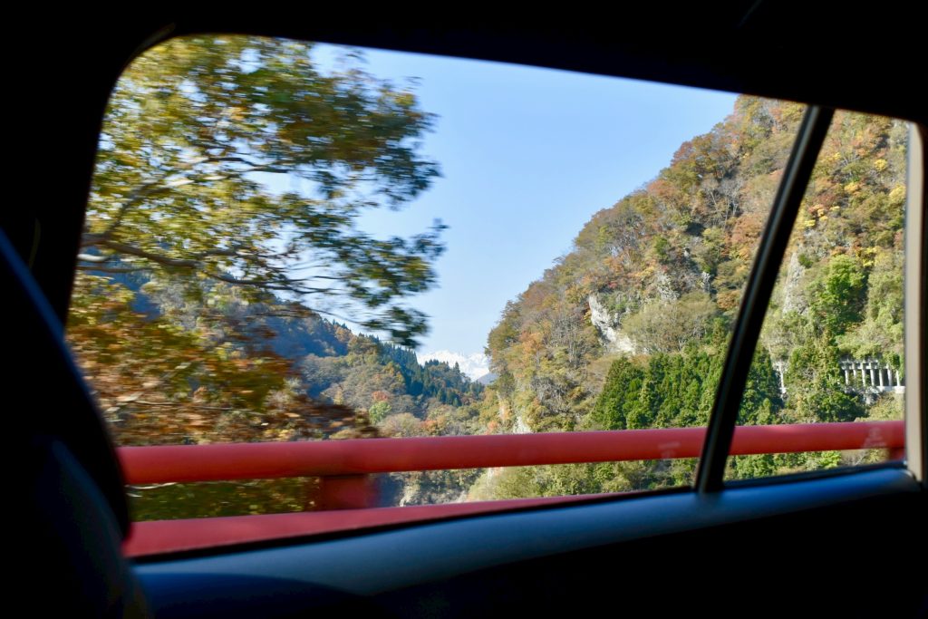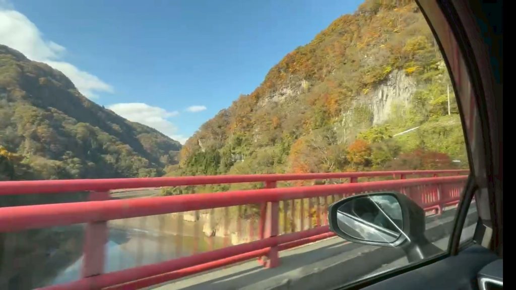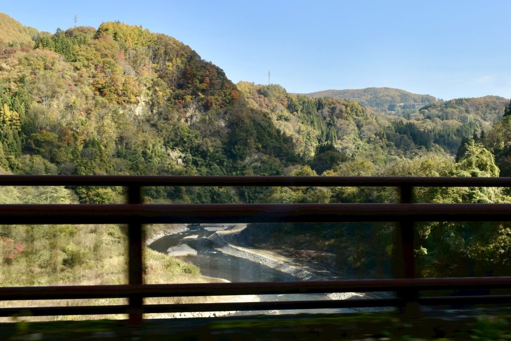 山と川と橋とご対面!11月になるともう木々に色が付き始めていますね~。田舎に来たぞ!旅行しているぞ!という実感たっぷり。