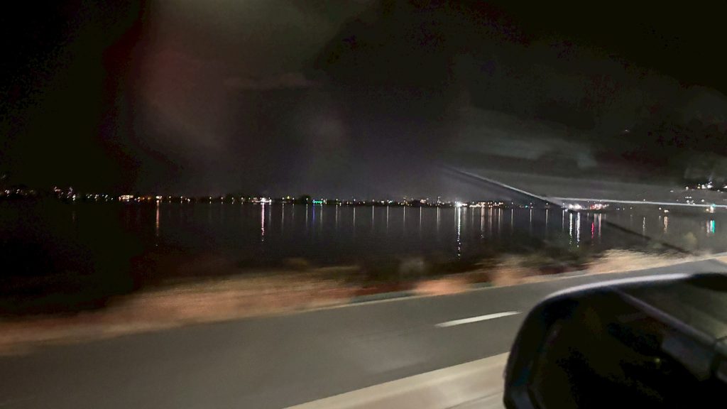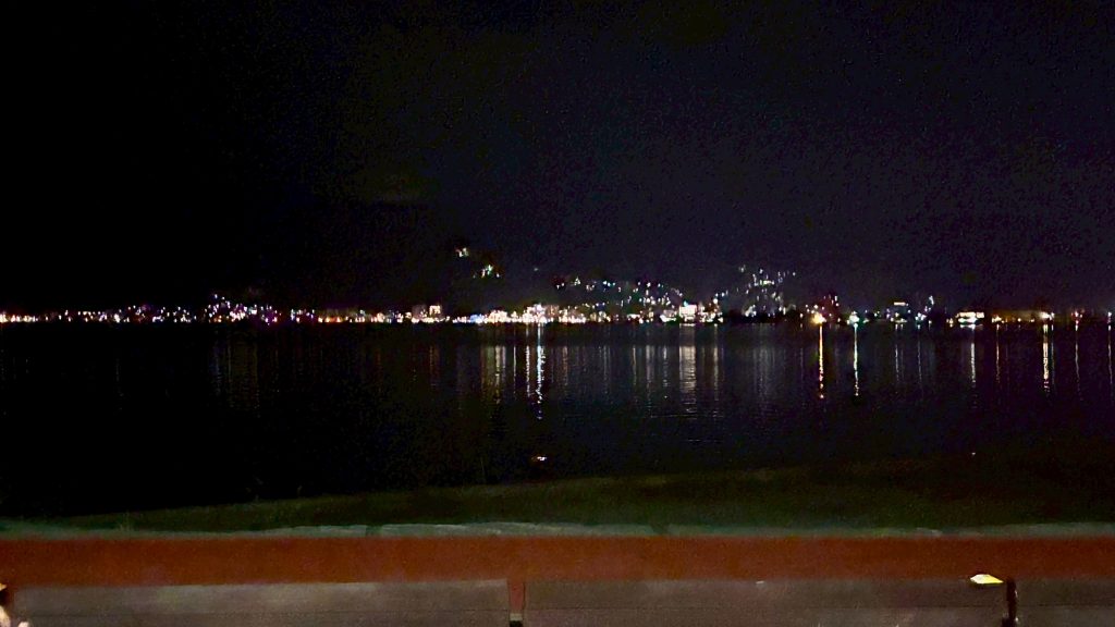 というわけでこのクルマで向かったのは諏訪湖、だったのだが……。高速渋滞に巻き込まれている間にすっかり暗くなってしまい、このような暗黒空間になってしまった。とはいえ対岸の灯りがきれい。
