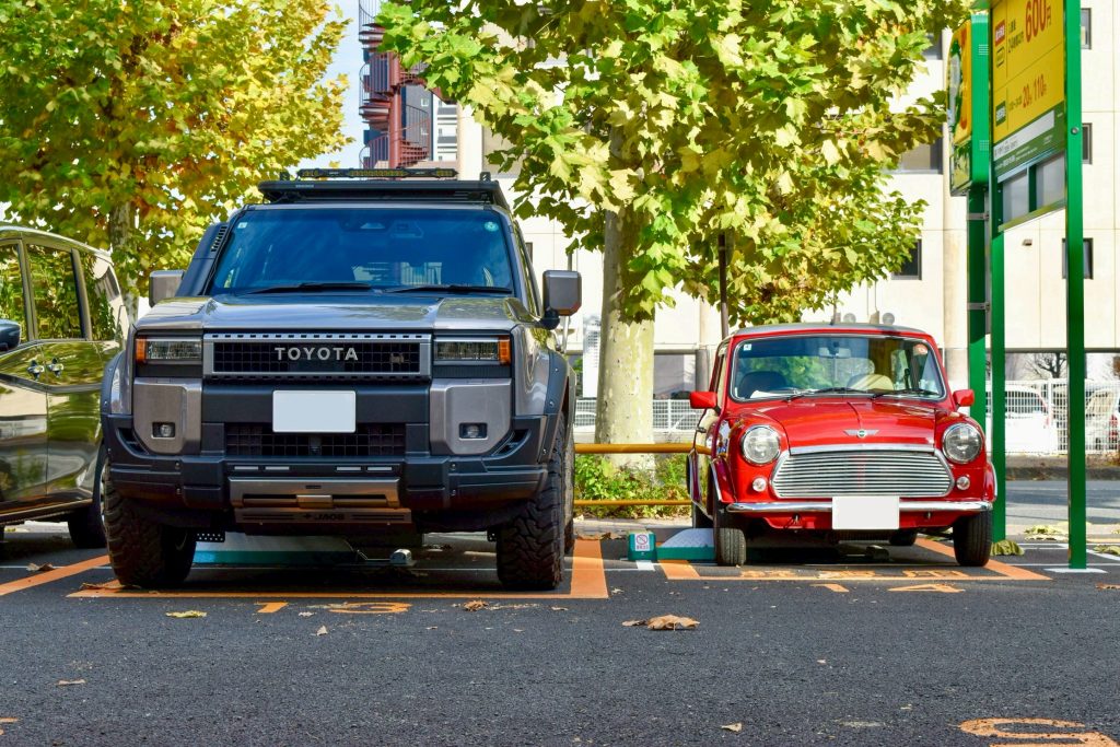 コインパーキングで隣にいた「ミニクーパー」とパシャリ。目の錯覚かと思うほどサイズ感が違って思わず笑ってしまう!戦車みたいなランクル、いいクルマでした。