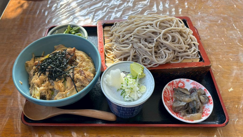 ざるそばと親子丼セットをすする!ネギとワサビ以外に大根おろしも薬味についてくるのってあんまりないのでは。親子丼も出汁がとってもおいしい!野沢菜が長野を感じられていい感じ。