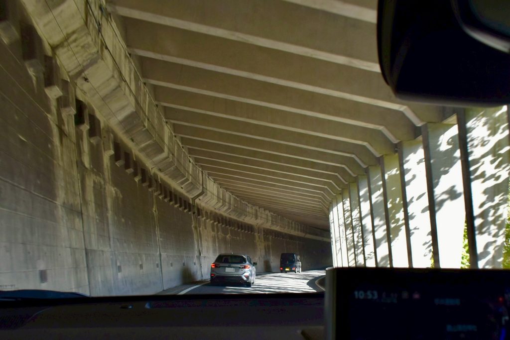 このクルマを借り受けた場所から少し西に進むと峠道を発見。エンジンも温まったので少し運転を楽しむことに。日の差し込むトンネルを抜けると……