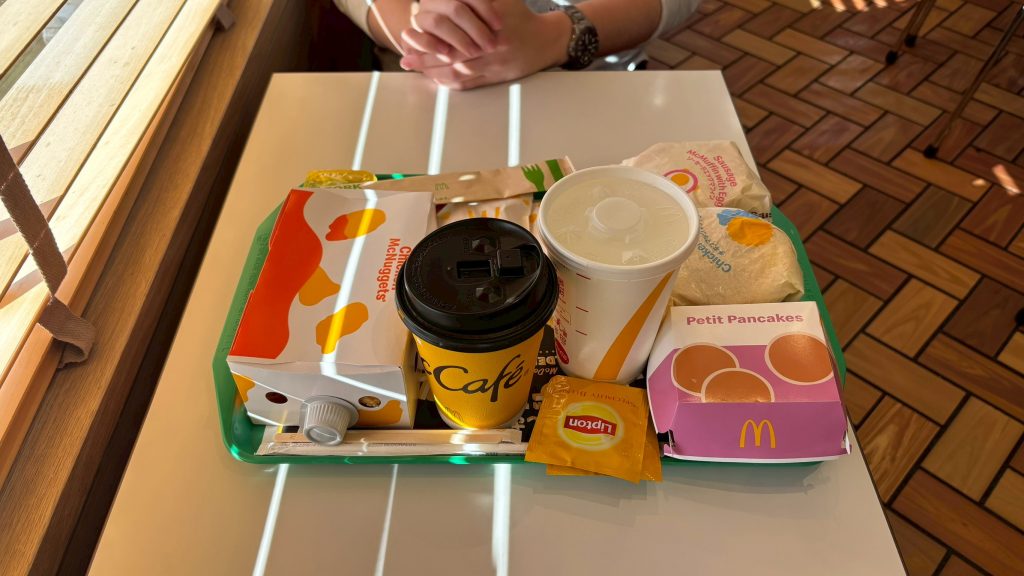 朝食は長野らしさゼロ、朝マックを食らう!!マフィンにハッシュドポテトにチキンナゲット15ピースとパンケーキの欲張りセット。久しぶりに食べたプチパンケーキ、すっごいうまかった。