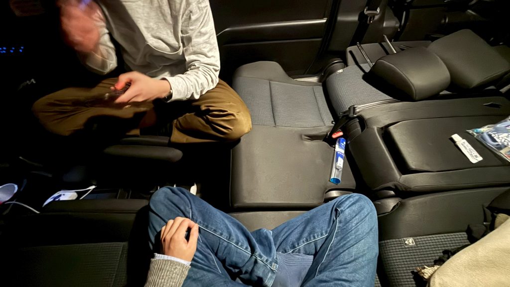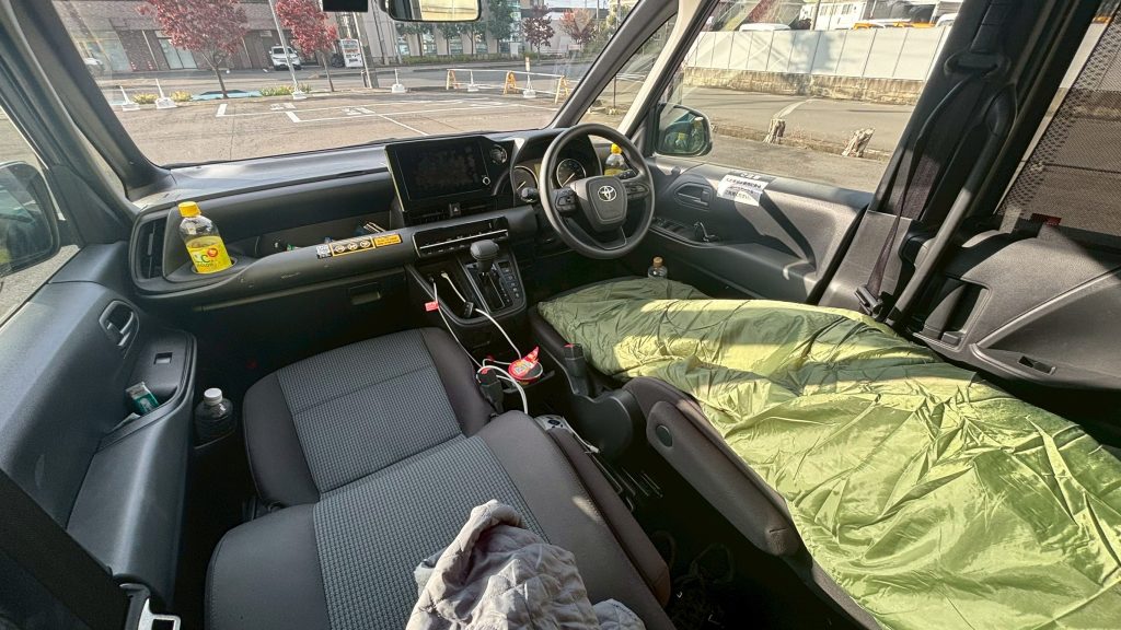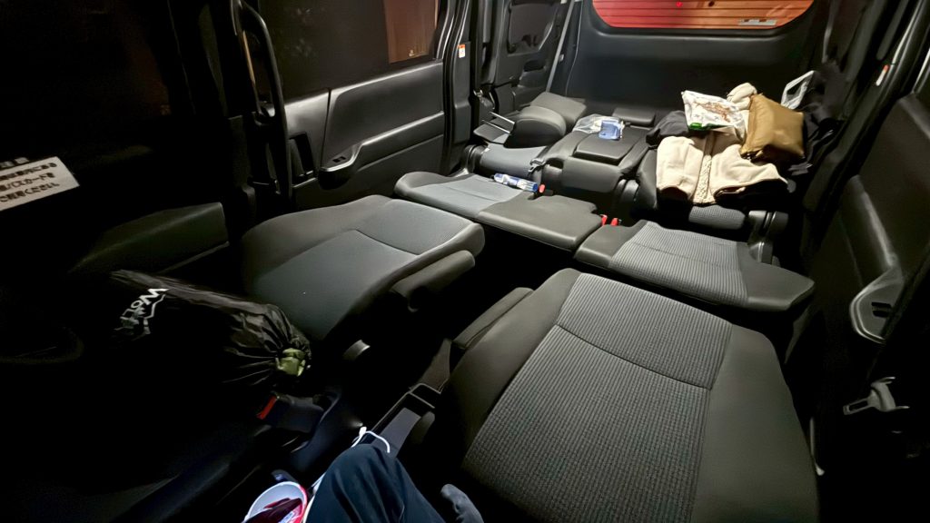 実は筆者は初車中泊。そもそもよく寝れるのか心配になりつつ。シートをすべて倒してみる。これで寝れるのかな?