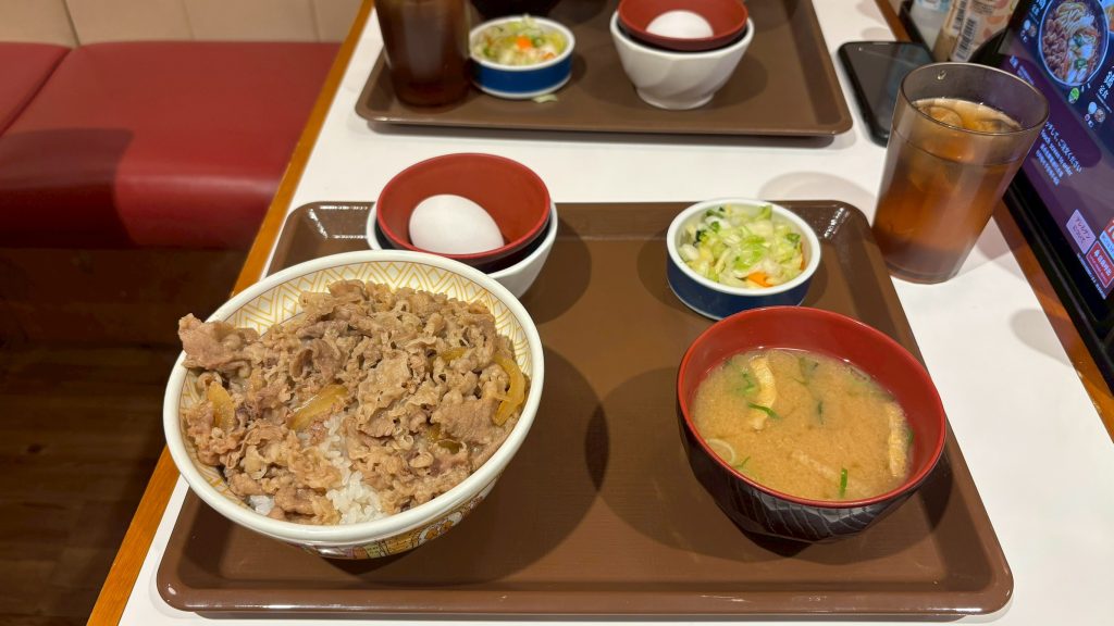 牛丼大盛りと3点セットを、水なのかお茶なのかわからない飲み物で乾杯。腹ペコなのですべて飲み干すように完食した。