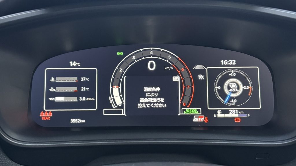 マニアックポイント⑥ GRカローラを借り受け、エンジンをかけた直後の様子。こんな警告出るんですね。水温37℃の油音21℃と、エンジンがキンキンに冷たかったため、温まってから楽しんだ。