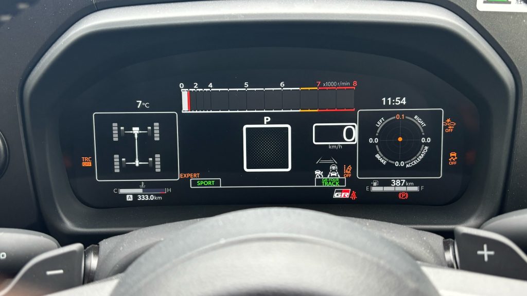 K:写真の駆動状況、Gメーターのほかにタイヤ内圧、ブースト圧なんかも見られて計器たくさんでかっこいい。いやーっ、また乗りたい……。