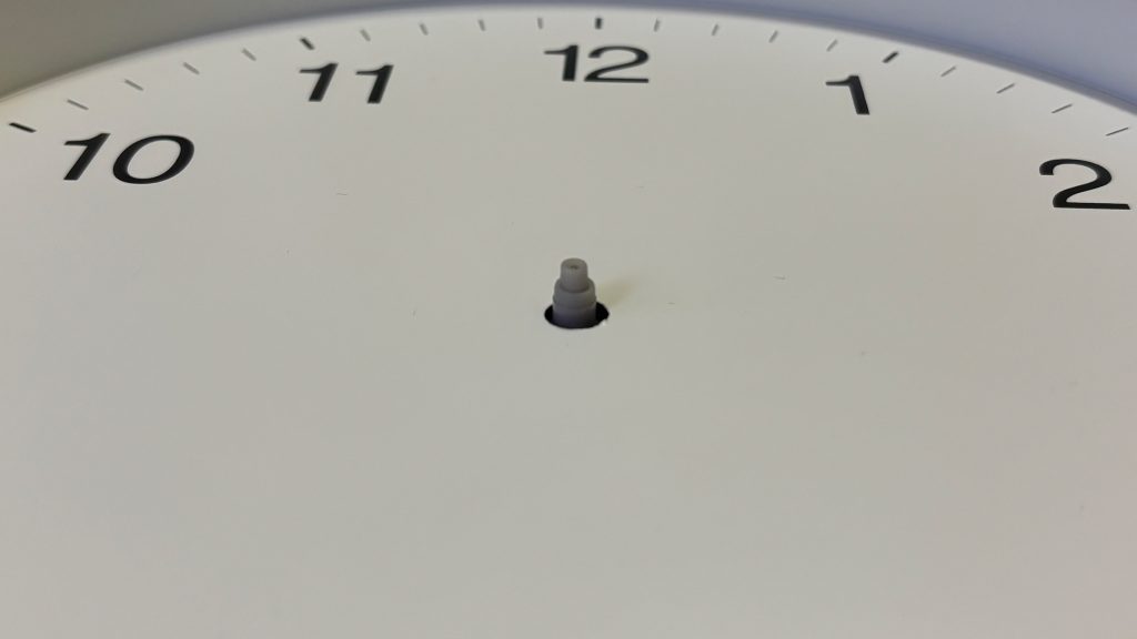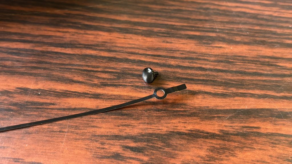 もともと秒針が刺さる部分が丸見えなので、針とキャップを分解してキャップだけ付けます。しげるの顔面に被っちゃうので秒針そのものとはお別れ。