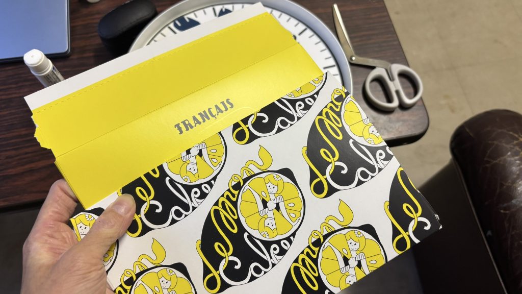 コピー用紙をそのまま針に貼ると(ダジャレじゃないですよ)ぺらぺらで頼りないので、厚紙で補強。使ったのは以前リハビリ記事の箸休めフォトに登場したレモンケーキの箱。