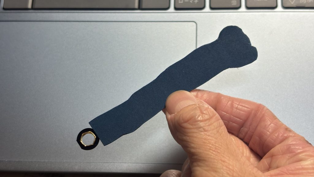腕を厚紙に貼り付けて切り抜き、両面テープで針に固定。