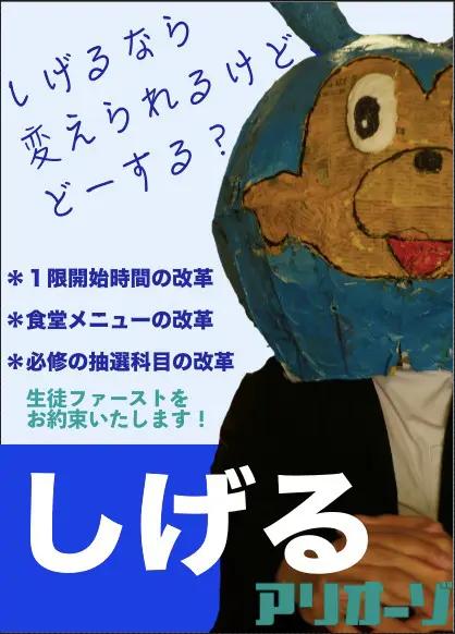 一方、上智大学では長年にわたりメインマスコットの座がソ◯ィアンくんによって独占されていた。 この状況を打破すべく、アリオーゾ公認マスコットであるしげるはついに動き出す。無謀とわかりつつも独裁打破のため、メインマスコットの座を賭けた選挙への出馬を決意するのであった……