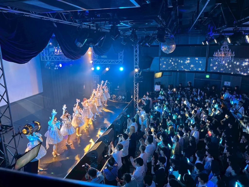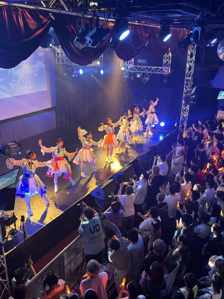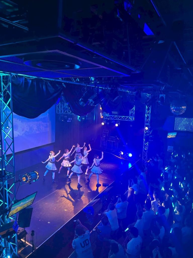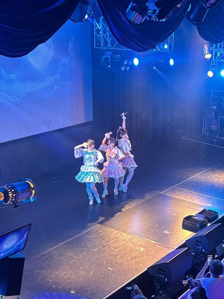 白メインの衣装とオーロラ布地が光が当たるとキラキラ色が変わって、可愛い過ぎる。胸元とスカートのフリルもふわふわで空まで飛べちゃいそうです。白い髪飾りもメンバーごとにデザインが異なり、統一感の中に個性も見れて楽しい。プリパラやラブライブなど私たち世代に刺さるエモい曲にテンションアゲアゲでした!ペアダンスや手を挙げる振り付けなど観客も巻き込む演出で、会場を沸かせていました。
