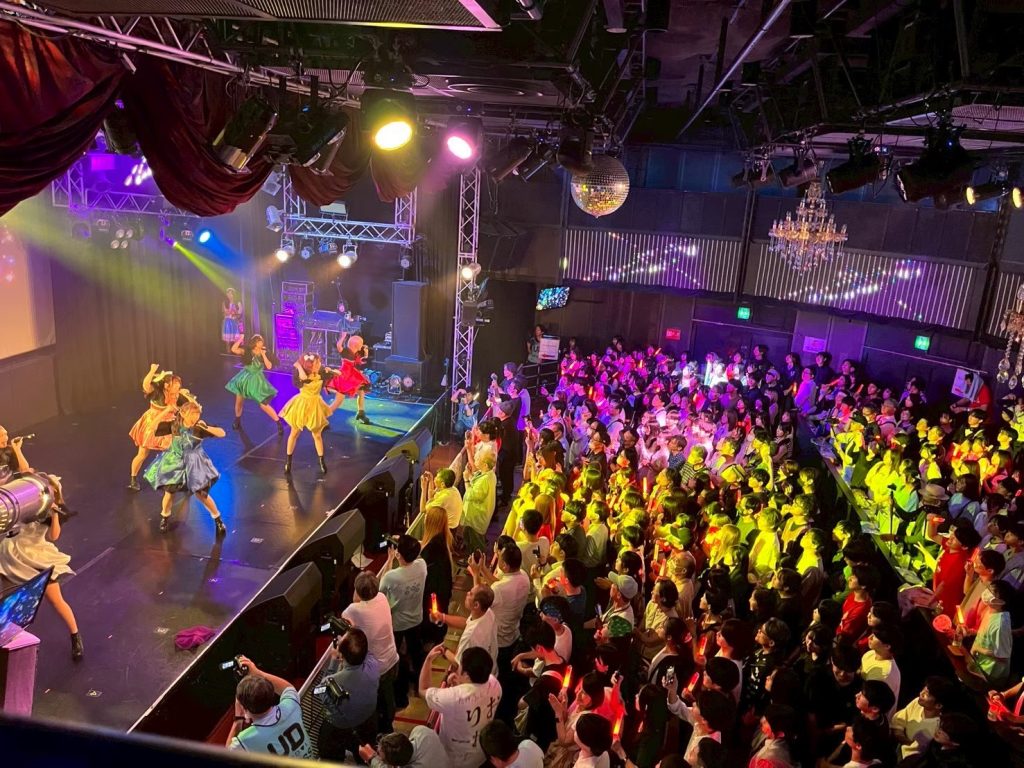推しの名前が入ったTシャツを着ている方や、可愛く飾り付けられたうちわを持っている方もいて、みなさんの愛が会場に満ちていました!!MCの方によると、下のファミレスのコーヒーがこぼれてしまうため、ジャンプは禁止なようです(笑)。