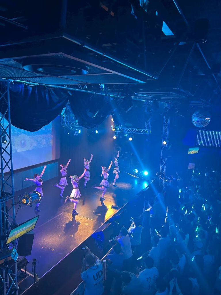 ファンの方との「ペンライトは水色で!」「はーい!」のやり取りが可愛らしくて一気に心が掴まれました。黒とグレーを基調としたチェック柄の衣装はシンプル可愛い、という感じで清楚で大人っぽい印象でした。ピンクと水色の髪色が対照的な二人による、機械的な曲調に合ったダンスは息ぴったりで、アイドルらしくないスタイリッシュなかっこよさでした。3曲目は夏の始まりを感じられる曲で、会場の水色のペンライトが映えていました。