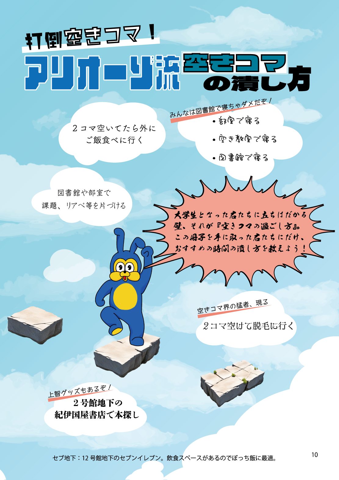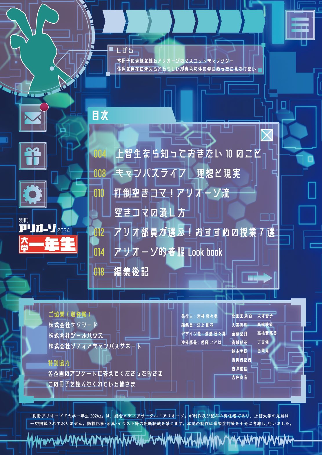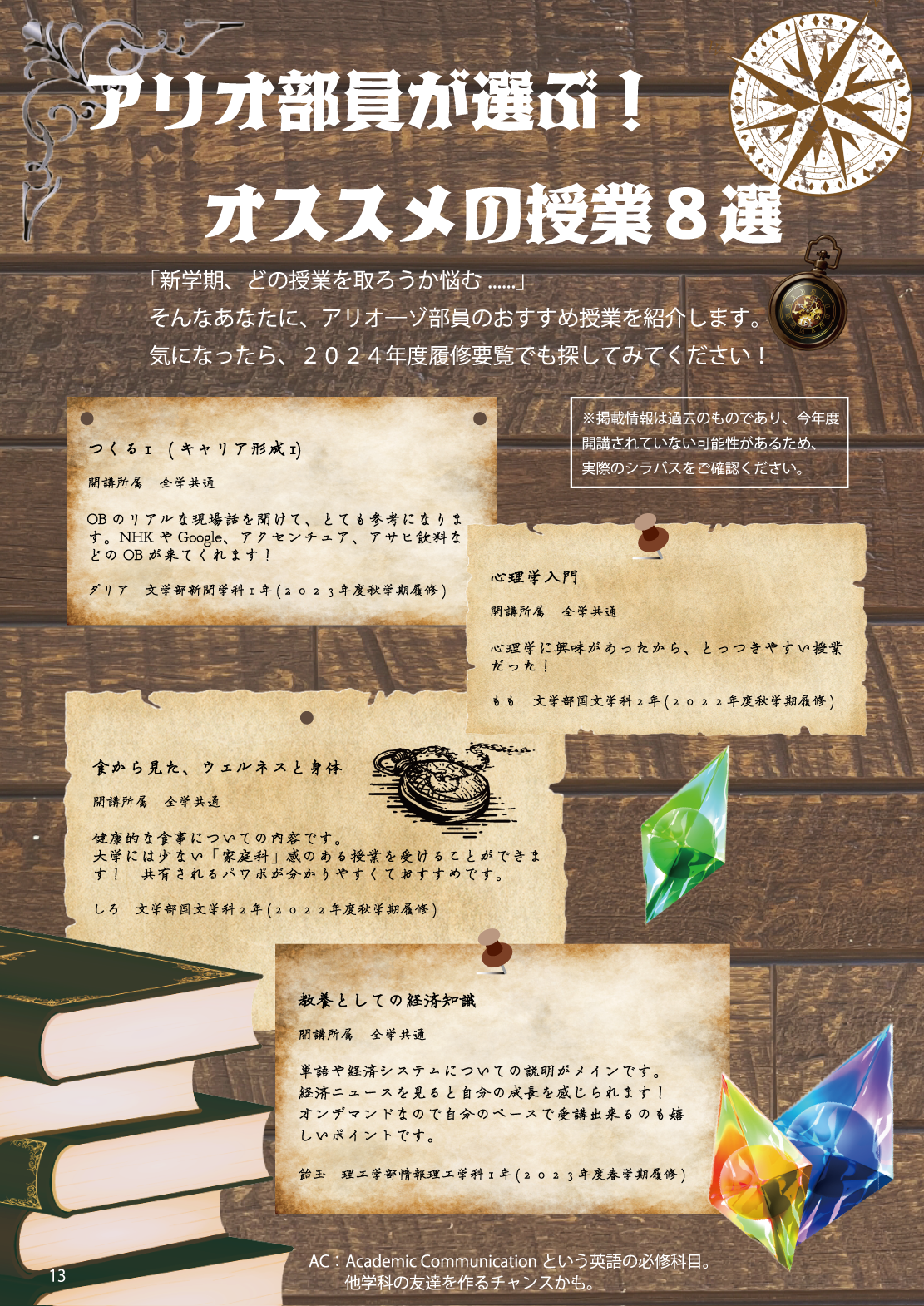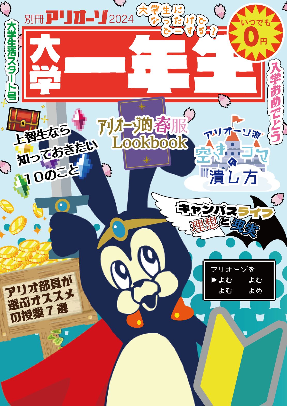 大学一年生2024 目次 上智生なら知っておきたい 10 のこと キャンパスライフ 理想と現実 打倒空きコマ!アリオーゾ流空きコマの潰し方 アリオ部員が選ぶ!おすすめ授業7選 アリオーゾ的春服 Look book 編集後記 Author きの子 沼は沈むよどこまでも View all posts