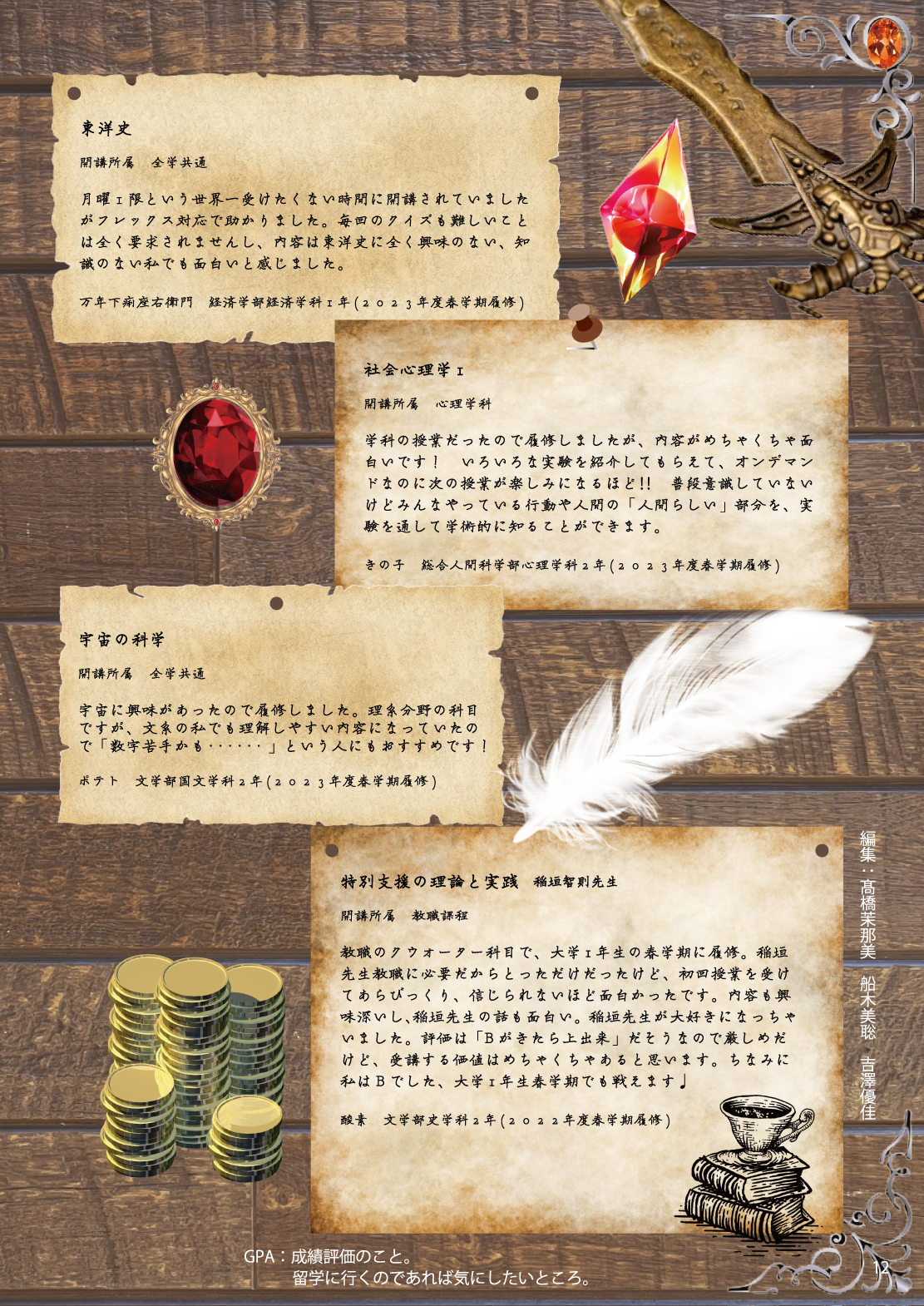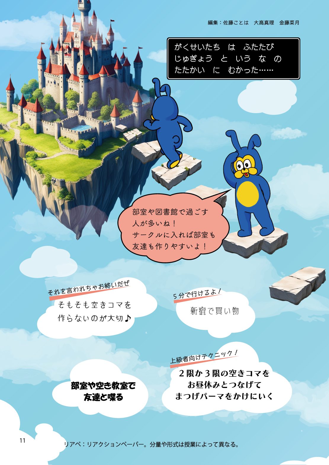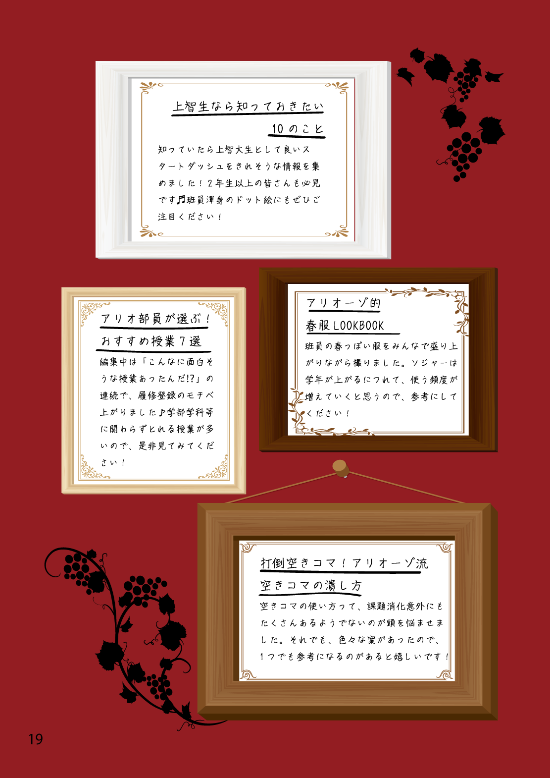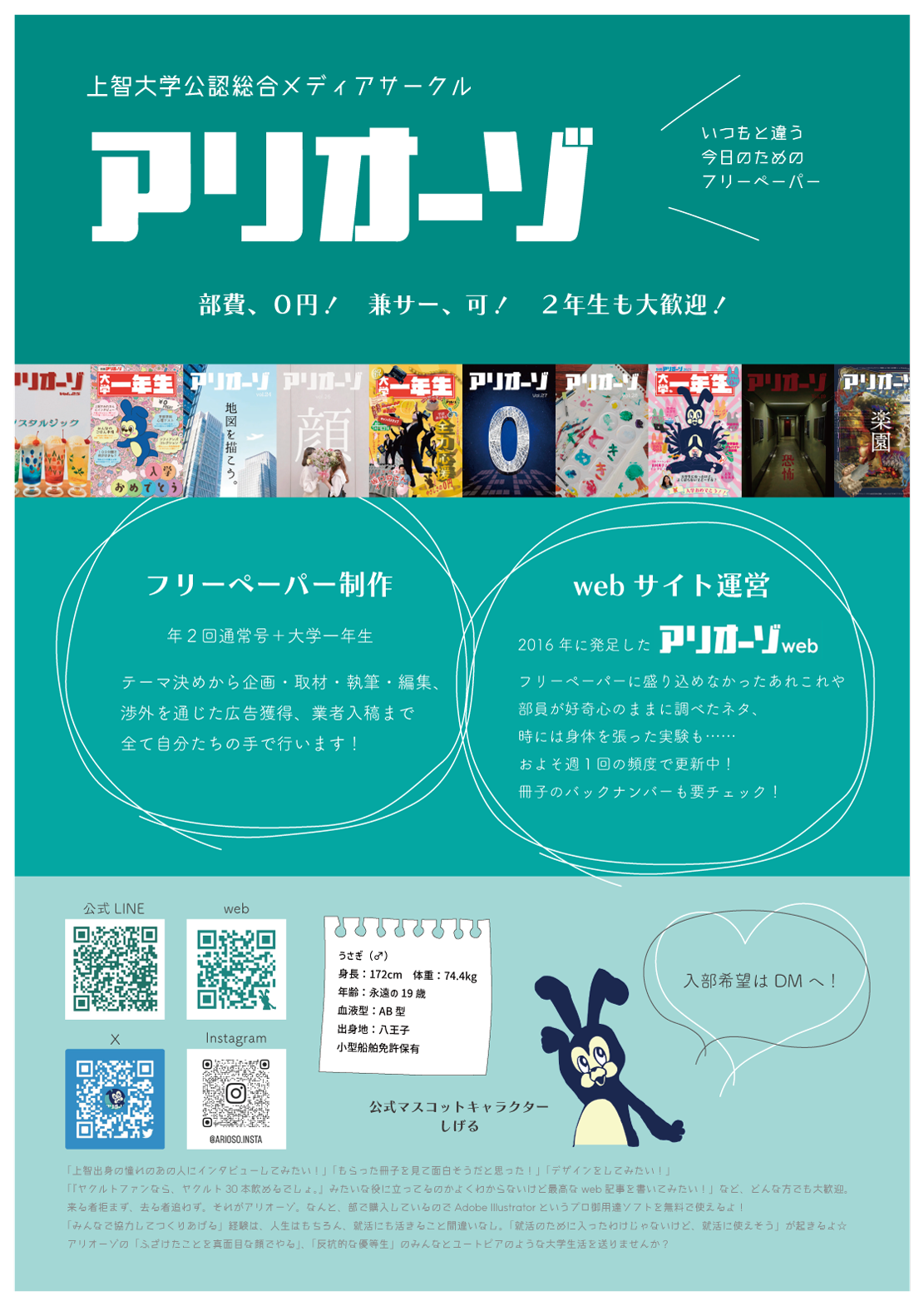 大学一年生2024 目次 上智生なら知っておきたい 10 のこと キャンパスライフ 理想と現実 打倒空きコマ!アリオーゾ流空きコマの潰し方 アリオ部員が選ぶ!おすすめ授業7選 アリオーゾ的春服 Look book 編集後記 Author きの子 沼は沈むよどこまでも View all posts